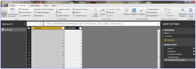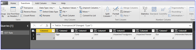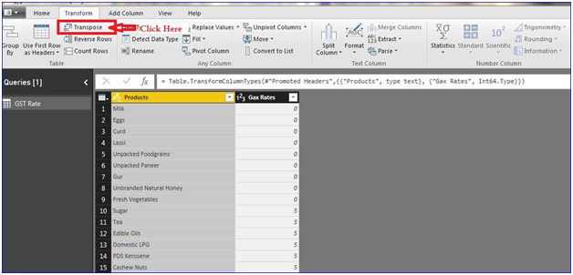 This is used to reverse the rows and column of a table. Once you select the column and click on transpose option the rows becomes columns and column becomes rows. For using it click on Transpose option of Transform tab as below.