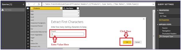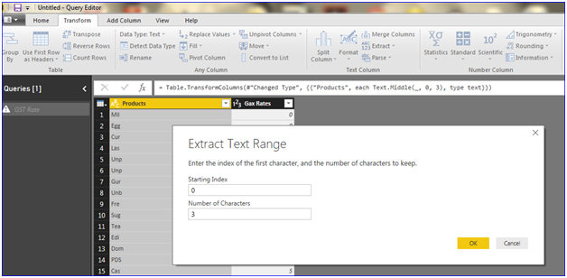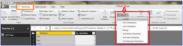 This is the part of data transformation in Power BI. It is used to extract characters from text value. We can use it to extract character from table. We can implement Extract by following methods like Length, First Characters, Last Characters, Range, Text Before Delimiter, Text After Delimiter and Text Between Delimiter. For using these functions select one of the available option in Extract of Power BI query editor’s transform tab. It is as below in image.