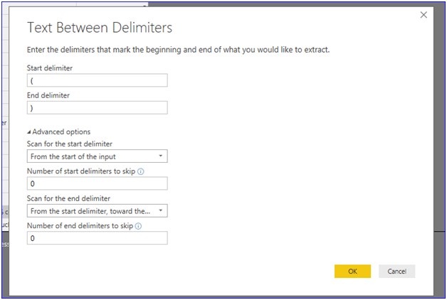 You can also use advance option for using Text Before and Text After delimiter option. You can set number of delimiters to be skipped and select either from the start of the input or from the end of the input as below. The default value for number of delimiter to be skipped is 0.