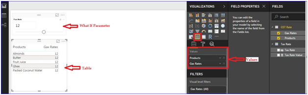 As stated above New Parameter can be used as a numeric slicer. So we will create a table and then use New Parameter as slicer. For this click on table option of VISUALIZATIONS available on report section and drag the value of column in values part of table. Now enter the value in What If parameter and click on enter. The result after filter based on the numeric slicer will be displayed as shown below.