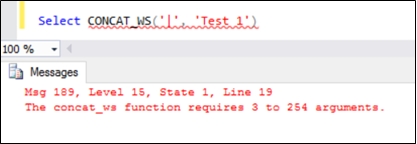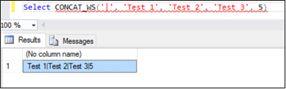 - Select CONCAT_WS('|', 'Test 1', 'Test 2', 'Test 3', 5)