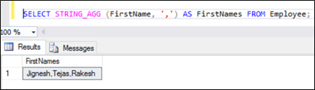 - SELECT STRING_AGG (FirstName, ',') AS FirstNames FROM Employee;