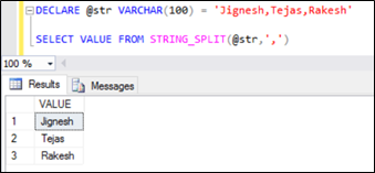 - DECLARE @str VARCHAR(100) = 'Jignesh,Tejas,Rakesh'