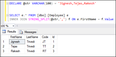 - INNER JOIN STRING_SPLIT(@str,',') f ON e.FirstName = f.Value