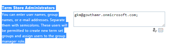You can enter the user names, group names, or E-mail addresses. Separate them with semicolons. These users will be permitted to create new term set groups and assign the users to the group manager role.