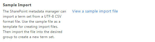 SharePoint metadata manager can import a term set from a UTF-8 CSV format file. Use the sample file as a template to create import files. Now, import the file into the desired group to create a new term set.
