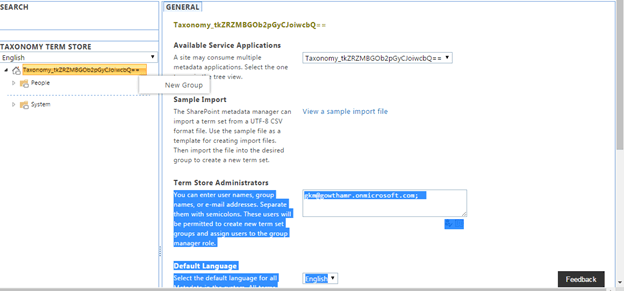 Now, select the right hand side of Taxonomy_tkZR link to create new group, but initially the admin doesn’t have permission to create a term store. Thus, add a user name into the section given below.
