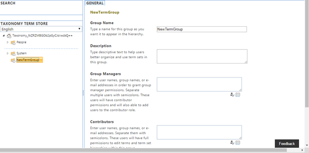 Type a name for this group as you want it to appear in the hierarchy and descriptive text to help the users better organize and use term sets in this group.
