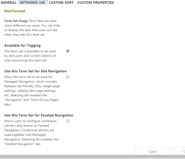Term Sets can have many different use cases. You can hide or display the tabs that the users will see when they edit this term set. This term set is available to be used by the end users and content editors of the sites consuming this term set.