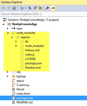When you open your project structure, you will find that a new directory “node_modules” has been added and this directory contains a sub directory named as “express”. It indicates that the Express dependencies has been installed successfully in your project.