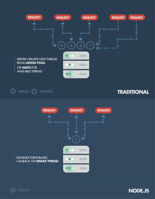 Node.js is a JavaScript runtime that uses the V8 engine developed by Google for use in Chrome. V8 compiles and executes JavaScript at lightning speeds mainly due to the fact that V8 compiles JavaScript into native machine code. For example, a function to read a file may start reading a file and return the control to execution environment immediately so that next instruction can be executed. Once file I/O is complete, it will call the callback function while passing the callback function, the content of the file as parameter. So there is no blocking or waiting for File I/O. This makes Node.js highly scalable, as it can process a high number of requess without waiting for any function to return result. (Tutorials Point)