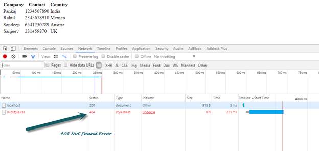 You can see that we get table formatted data that we send as read from the “index.html” page, but it doesn’t contain the style properties that we defined. So, what is going wrong? Let’s check the issue. Now, right click on page and click on “Inspect Element”. In Network section, you will find that for “midStyle.css”, we are getting “404 Not Found” error.