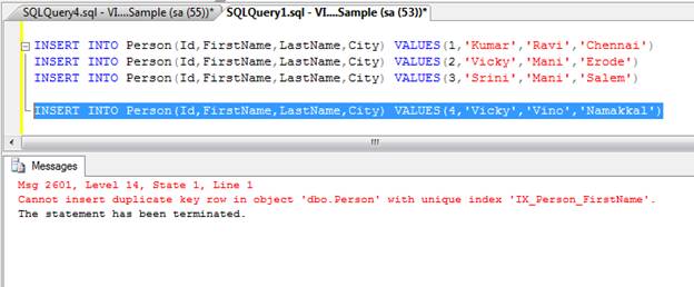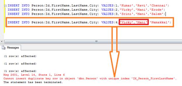 After creating unique Composite Non Cluster Index we cannot enter duplicate values with a combination of two columns. For example we insert three records with different values, then the fourth one tries to insert the same “FirstName” and “LastName” but it gets an error because of the unique Composite Non Cluster Index.