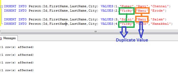 We are creating Non Cluster Index for FirstName columns in the “Person” table. After creating we can enter values and at the same can enter duplicates into table. The below screen shots show how we can enter duplicate values in Non Cluster Index