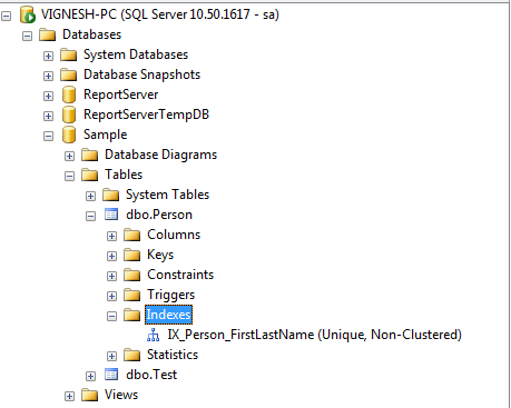 We can see which index we created for our table. Open object ,explore and go to database, then go to corresponding table under database. Now expand the table, then expand index under the table. Below screen shot shows index name and type of index name. Non Cluster Index is non-unique.
