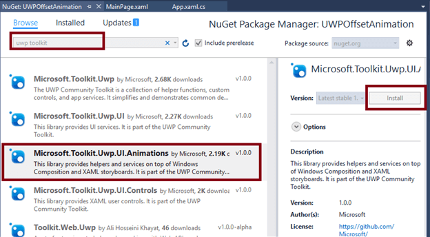 Choose Browse and search Microsoft.Toolkit.Uwp.UI.Animations, select the package and install it.