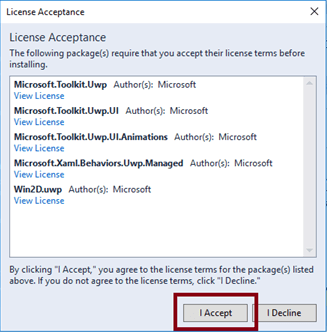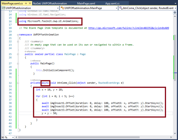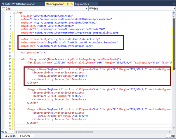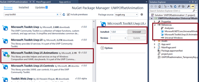 Open (double click) the file MainPage.xaml in the Solution Explorer and add Microsoft.Toolkit.Uwp.UI.Animations reference in the project.