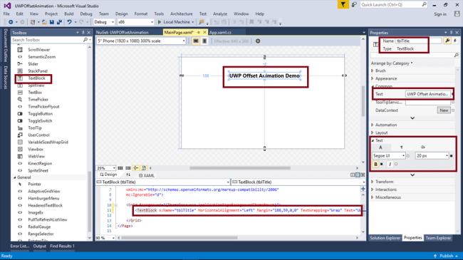 - <TextBlock x:Name="tblTitle" HorizontalAlignment="Left" Margin="188,59,0,0" TextWrapping="Wrap" Text="UWP Offset Animation Demo" VerticalAlignment="Top" FontWeight="Bold" FontSize="20" />