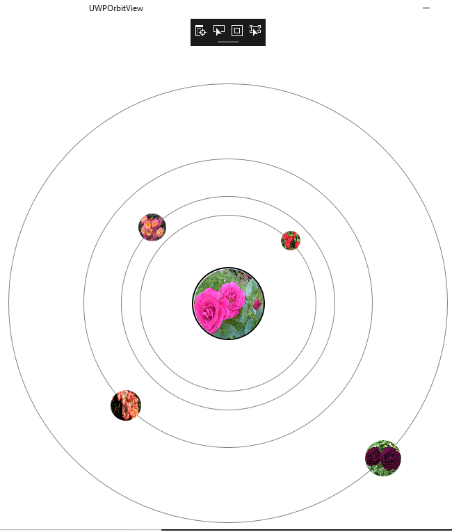 The OrbitView control provides a new control, inherited from the ItemsControl. All items are arranged in a circle around a central element. OrbitView Control is from UWP Community Toolkit. The UWP Community Toolkit is a collection of helper functions, custom controls, and app services. It simplifies and demonstrates common developer tasks building UWP apps for Windows 10.