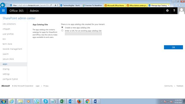 - You can create New App Catalog, so select the Create a new App catalog site and then click on OK.