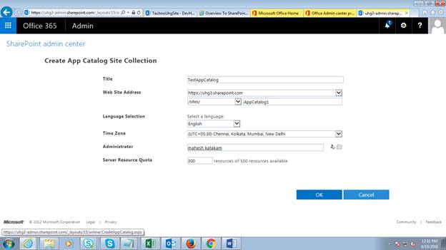 - Give title, Website Address, time zone and Administrator of the App Catalog. Finally Click on OK.