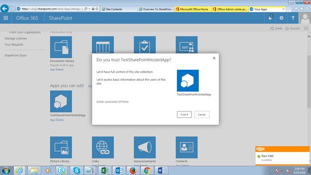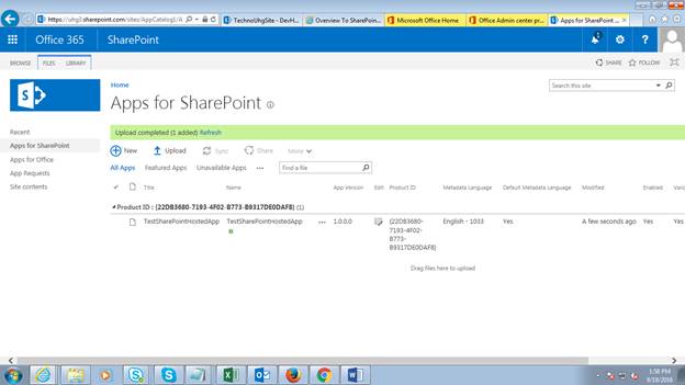 - I have uploaded Test Share Point Hosted App app to document library for testing purpose. You can upload your custom app to this library. After uploading, it will show App Name, version, product id and etc. as an item in the library.