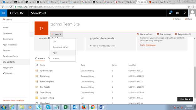 - New-> App-> select your custom App. In my case, I am selecting Test Share point Hosted App.