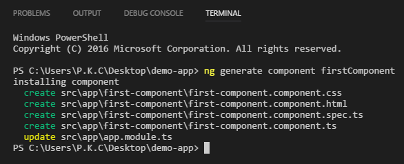 In will open a command prompt Window for this app. Now, write “ng generate component firstComponent” command. This command will generate a new component for our application.