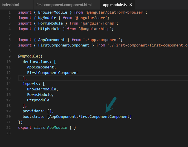 Now, the last thing that remains is to bootstrap this component. To bootstrap this component, go to module.ts file and add the reference of “first-component” component in bootstrap property.