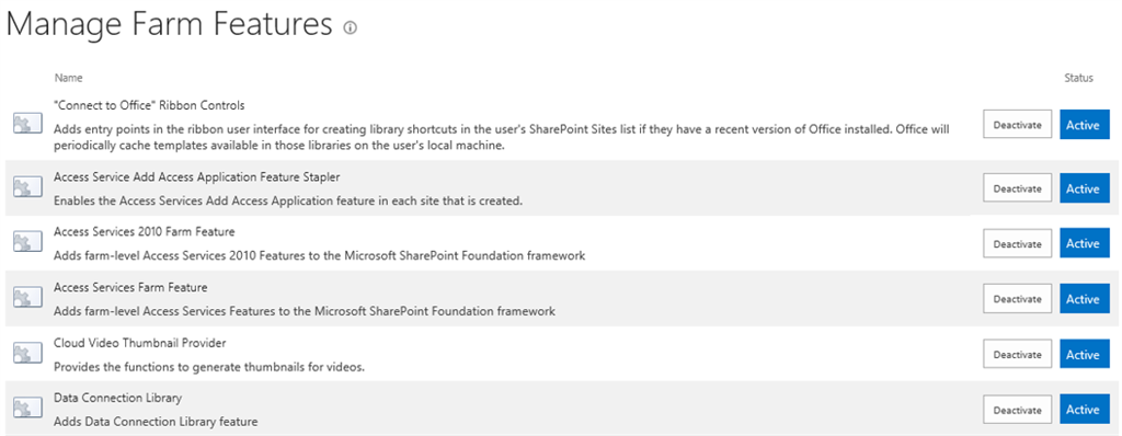 This page is used to manage (activate / deactivate) the farm level scope features in the farm.