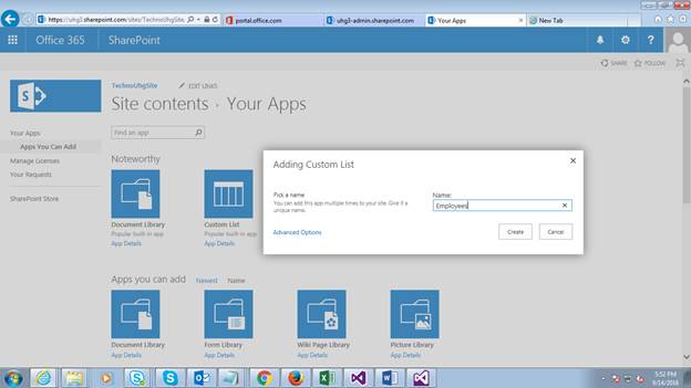 Open your office 365 Share Point site and create one list. Below find the steps and screen shots to create list with columns.