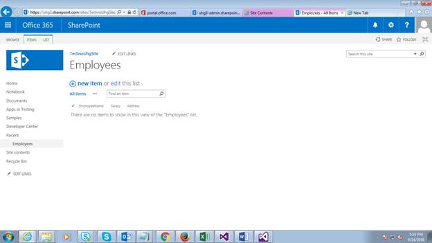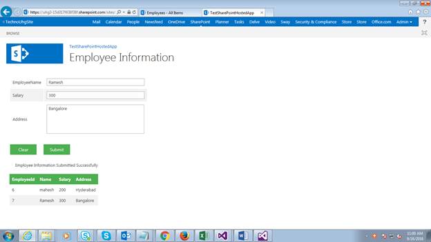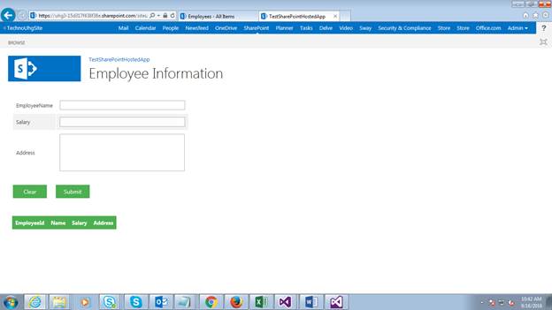 After completion of user Interface, we need to write the business logic for Insertion and Display operations. You can write business logic in App.js file or same page (default.aspx), or you can take separate .js file.