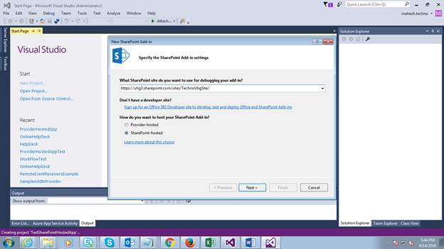 - Provide the office 365 SharePoint Url and select the SharePoint-Hosted App option.