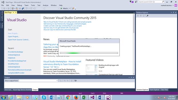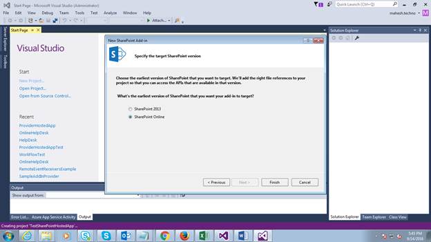 - Create a project name called ‘TestSharePointHostedApp’ by selecting SharePoint Add.