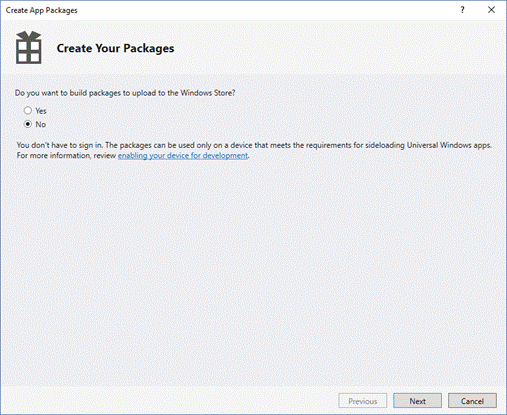 In Windows 10 UWP development, we we can upload an app to the Store or distribute that to other users directly by side loading the app package to a device. For that, first we need to create the app package and then side load it to the device.