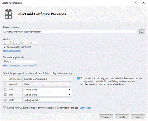 The system will now ask for package output location and supported architecture, like the following screen. Fill in the required details, click "Create", and wait until it creates the app package.