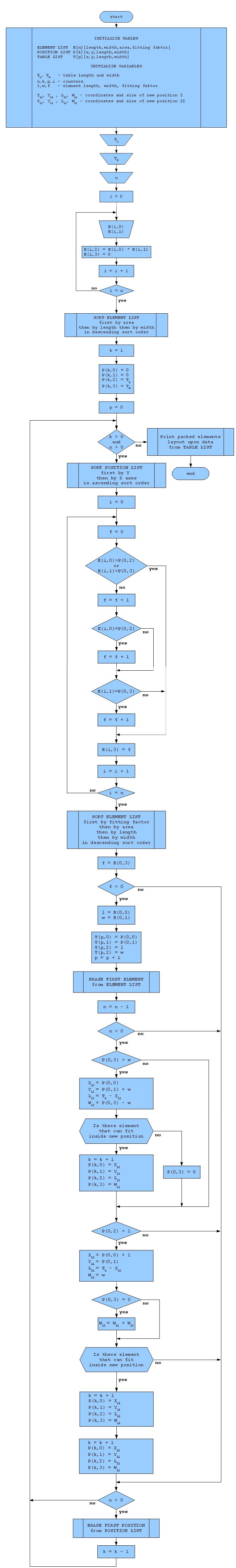 - Before packing process starts, all elements must be horizontally oriented and sorted in descending order by size of it's area then by length then by width.