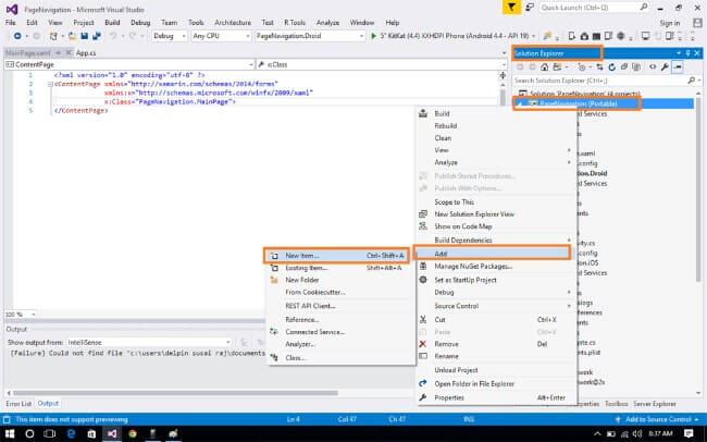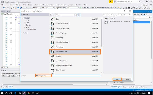 In this step, add one Page, whose name is called MainPage.xaml. Go to Solution Explorer-->Your Project-->Portable-->Right click-->Add-->New Item (Ctrl+Shift+A).