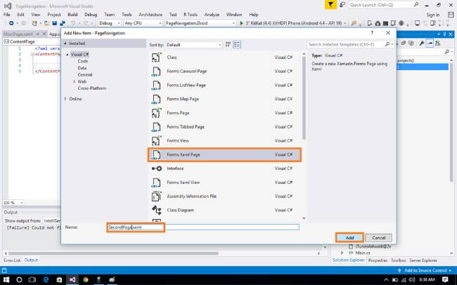 Now, select Forms XAML page and give the name (SecondPage.xaml).