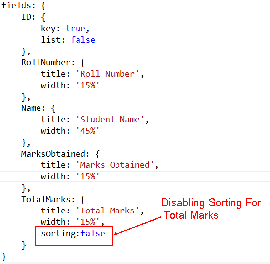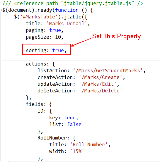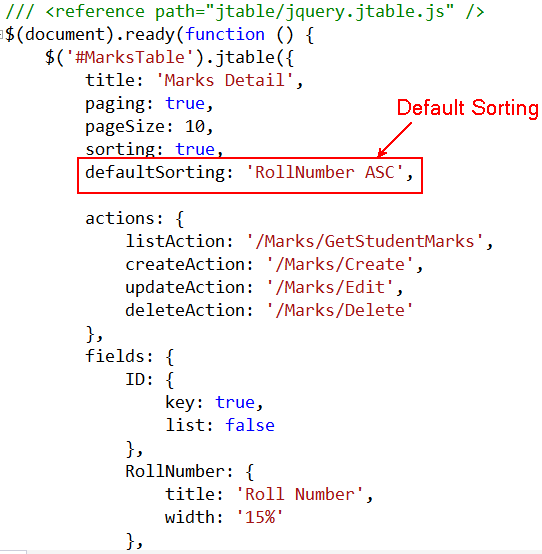 Step 5: Now open Script.js set defaultSorting to RollNumber ASC. Because when first time data will be load then it will be sorted by RollNumber.