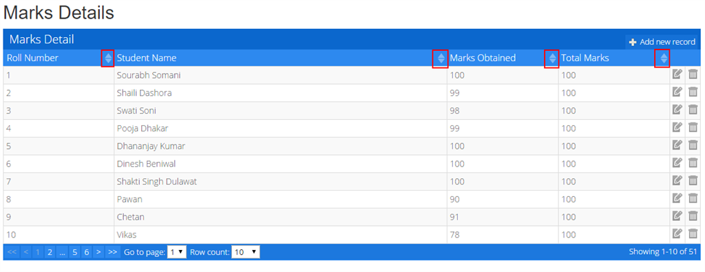 Now you can see inthe above figure that after setting sorting property to true some sorting icons are generated in all headers. But there is no use to sort Total Marks. so we can remove sorting icons for Total Marks.