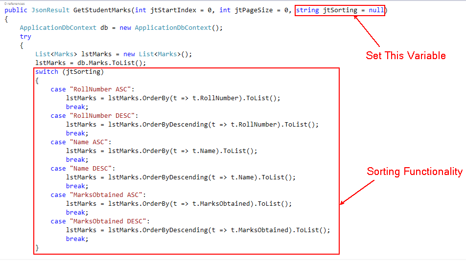 Step 4: To perform sorting functionality we have to write some functionality inside GetStudentMarks action method which will be as follows: