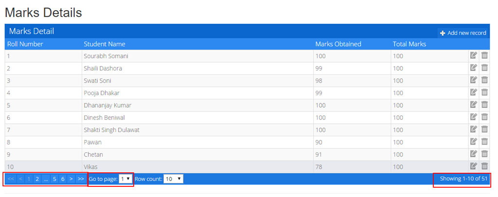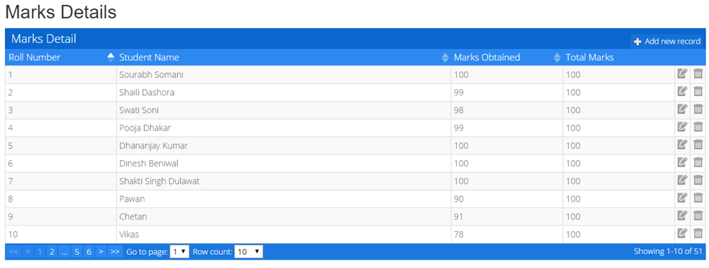Now you can see above we have one table footer there, where we can see complete pagination option. But all the options are not looking and working perfectly. To make it perfect you have to change into action code of listAction. In this example we have listAction Action with name "GetStudentMarks", which is located inside MarksController. So we have to modify inside this.