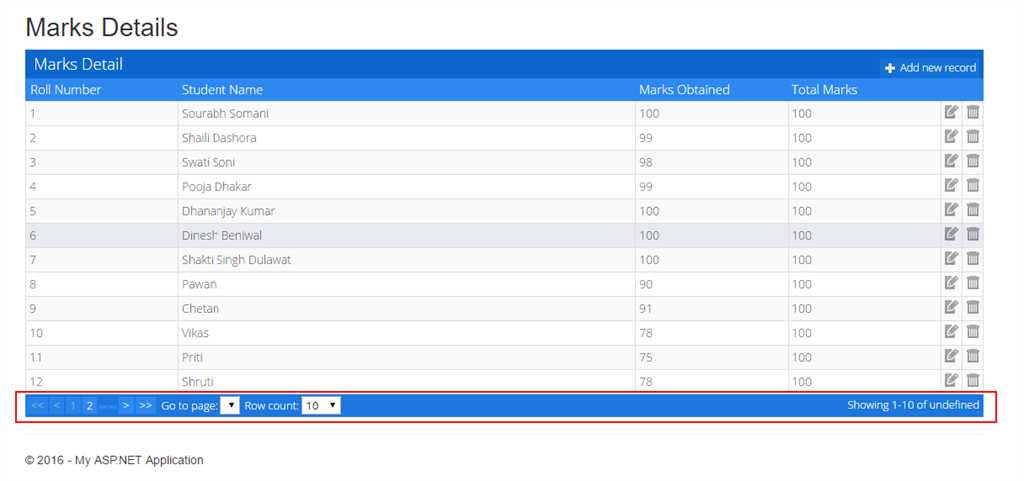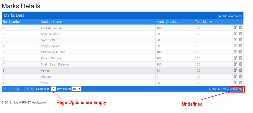 In the above output you can see still we have bug that number of records are undefined and page options are blank.