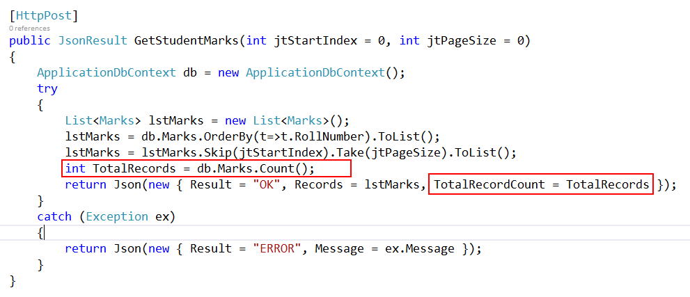We are getting this problem because to the client we are not showing how many records exactlyare present in the database so we have to tell this jTable Grid that we have as many records that can be possible by setting TotalRecordCount property's value from controller. So go to the GetStudentMarks action and write following code: