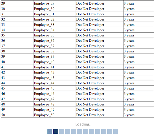 Now, the last thing to know is from where we are calling this method. In the code, you can see that we are calling the CallWebMethodForMoreRecords from the loading event, and doing a delay of four seconds. It is because it is loading the data so fast that we don't even realize that the data is loaded. Also, we want to make our web page look good. So, it will show loading for 4 seconds and then it will call the web service Webmethod; that's it. We are done and ready to rock. We will have the output like this when we scroll at the end of the page.