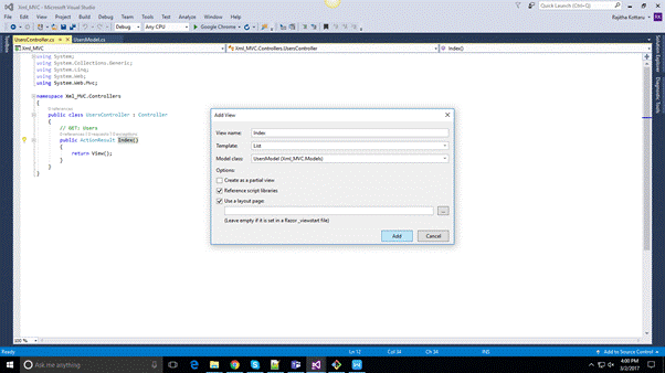 In Add View window, keep the View name as Index, select template of List type, select the model class UsersModel, and click "Add".
