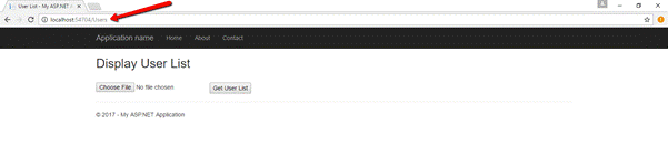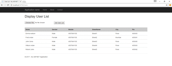 As we are using the same View for file upload and display user list, let’s set a flag called @ViewBag.ShowList to show/hide the user list. Here, we are not performing any CRUD operations on the list. I am going to remove the unwanted code from the View.
