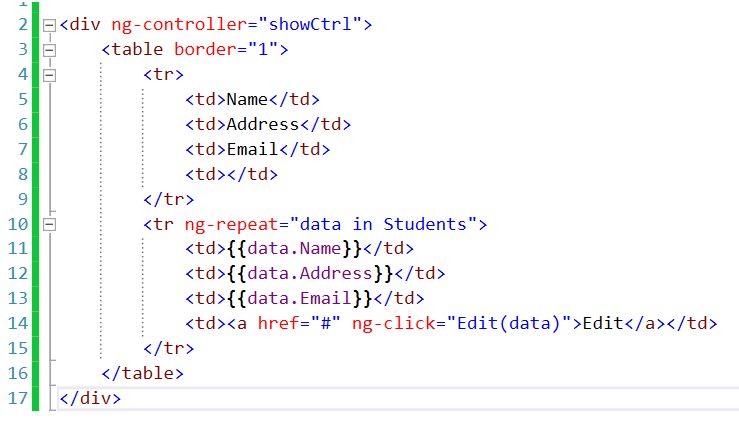 Step 7 In Show.html page, it shows data with the help of ShowCtrl controller, as shown below: