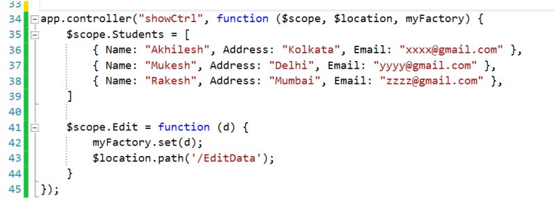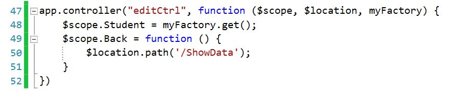 We also injecting $location Service with the help of this, when we click the edit button i.e routing redirect to EditData routing and Edit.html page.